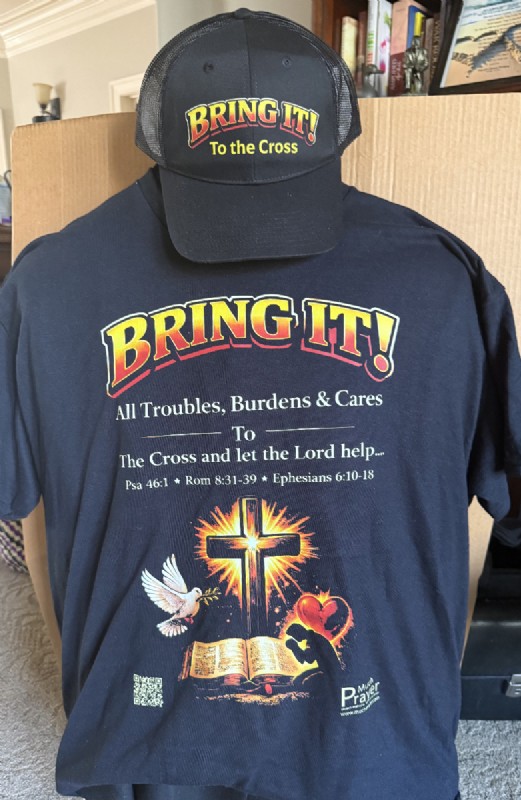 Bring It to the Cross Tee Shirt is imprinted front and back with a QR code on the front which takes one to a landing page where the shirt can be ordered and one can learn more about the message related to the shirt's imagery! The shirt is available in gray, black, yellow, and green colors; medium, large, XL, 2XL, 3XL, 4XL, and 5XL Sizes. The shirt can be used for personal and evangelistic outreach initiatives. Shirt and cap sold separately!